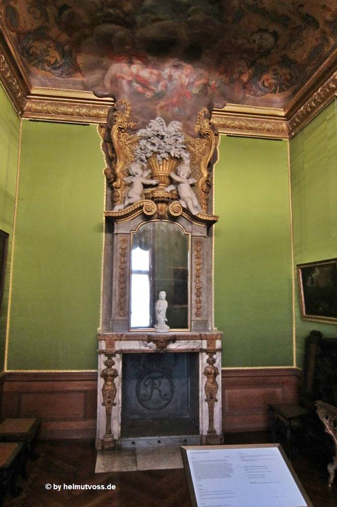 Bilder oben: Kabinettsaal in grün und Deckengemälde. |
