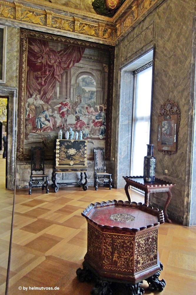 Das Audienzgemach Koenig Friedrich I. Die Wandteppiche aus Brandenburg-Preußen, entstanden zwischen 1680 und 1720. Hier gibt es eine Anzahl naturfarbener Möbel mit vorzüglicher Einlegearbeit. |