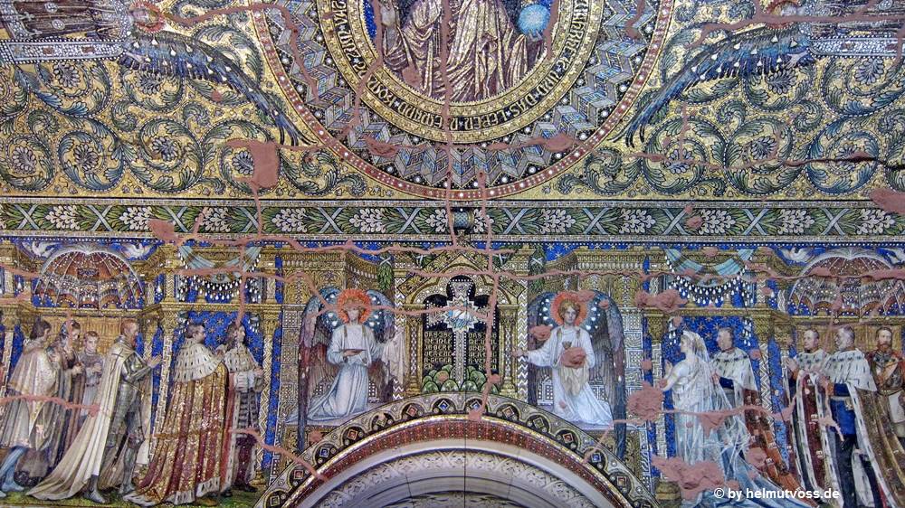 Die gesamte Decke der Gedächtniskirche ist mit prunkvollen Mosaiken verziert. Bild oben links: Der Zug der Hohenzollern: Hier schreiten die jüngeren Herrscher, angeführt von Königin Luise, zum Abendmahl. |