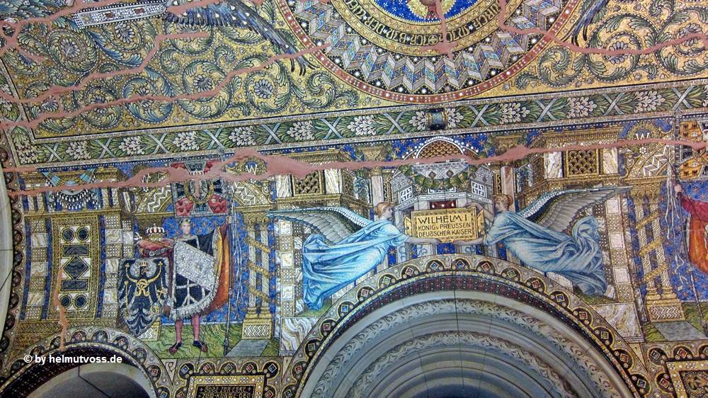 Bilder oben: Mosaik im Deckengewölbe der alten Gedächtniskirche Berlin. In der Vorhalle der alten Kirche befinden sich kunsthandwerklich bedeutende Mosaiken, die von Hermann Schaper entworfen und der Firma Puhl & Wagner ausgeführt wurden. |