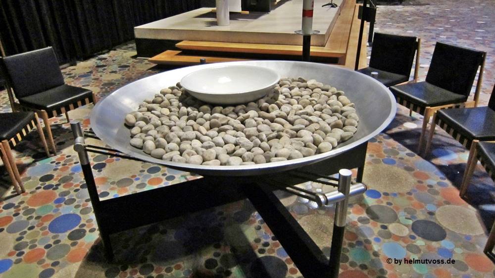 Bilder oben links/mitte: An der Nordseite des Kirchraums erinnert eine Bronzetafel mit Kruzifixus (Spanien, 13. Jhd.) an die evangelischen Märtyrer aus der Zeit des Nationalsozialismus. Bild oben rechts: Links neben dem Altar in der Taufschale aus Aluminium liegen carrarische Marmorkiesel und eine kleine Majolikaschale, die das Taufwasser aufnimmt. |