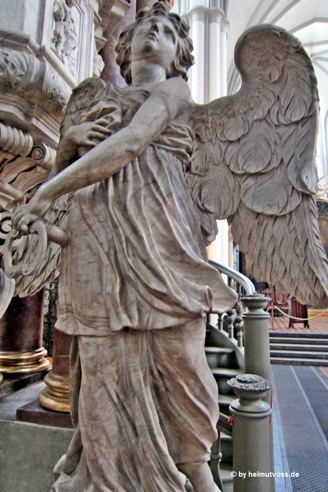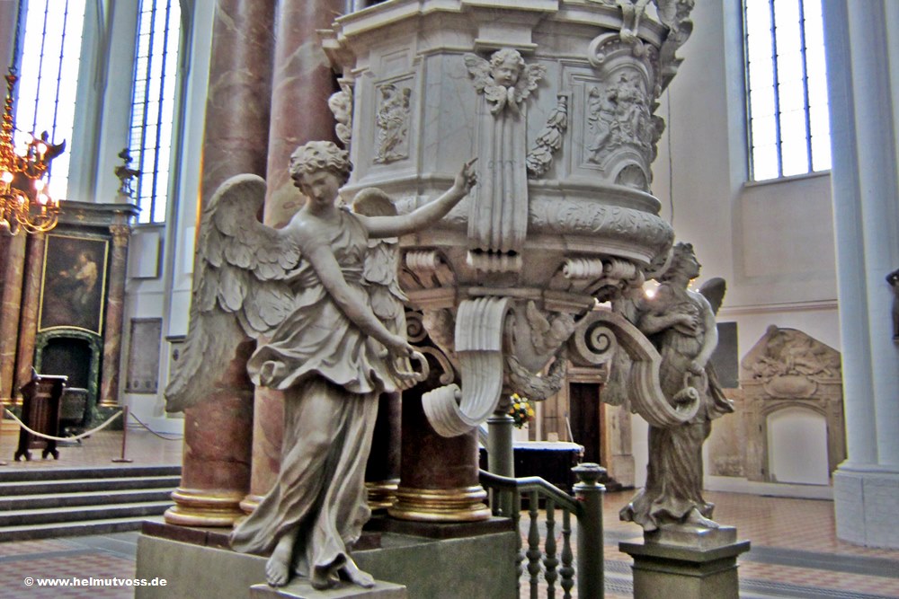 Die am 4. Juni 1703 geweihte Kanzel ist das Werk des Bildhauers Andreas Schlüter (um 1660 – 1714), der hölzerne Schalldeckel wird von einer barocken Engelgruppe und einer Strahlensonne bekrönt. Zwei barocke Engelsgestalten tragen den Kanzelkorb, dessen Marmorstuck Allegorien von Glaube, Liebe, Hoffnung zeigen. |