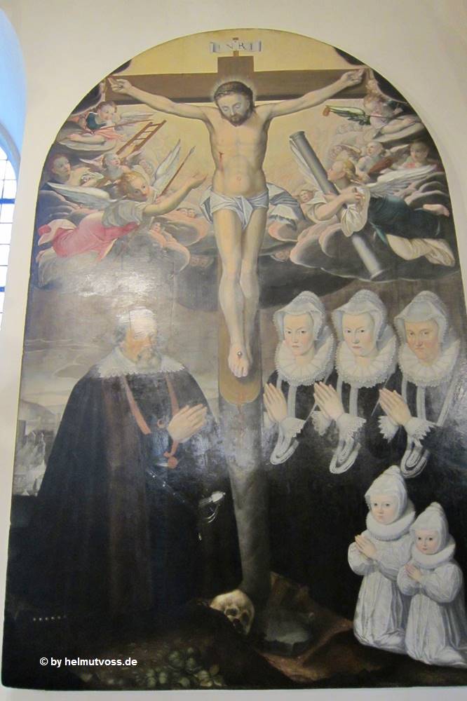 Bilder oben: Am Kopfende des nördlichen Seitenschiffes thront das Epitaph für Ehrentreich von Röbel (gest. 1630) und seine Frau Anna (gest. 1642), in Sandstein gearbeitet. |