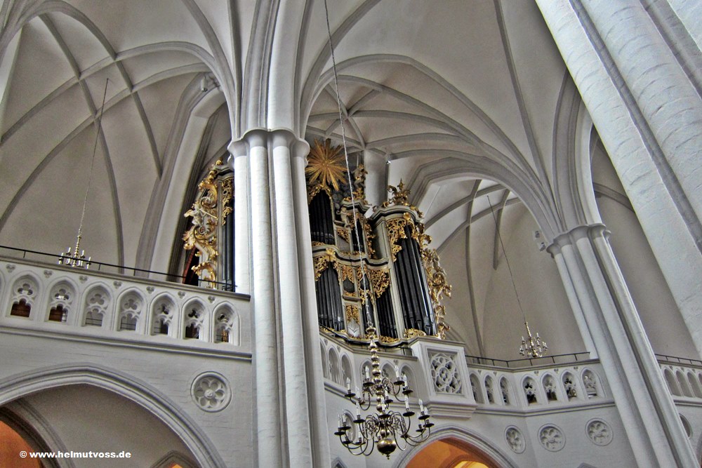 Die dreischiffige gotische Hallenkirche, mit den gestaffelten Bündelpfeilern und sich verkürzenden Gewölbejochen entlang bis zum lichten Chor. Bild oben mitte: Der Hauptaltar (um 1762) Barock, von Andreas Krüger. Die Gemälde stammen von Bernhard Rode. Das Taufbecken mittig vor dem Altar (1437) gotisch, Bronzeguss. |