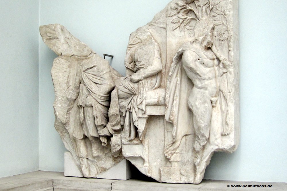 Bild oben rechts: der Nordfries. An der Stelle, wo der Nordfries an den Ostfries anschließt, beginnt Aphrodite den Reigen der Götter an dieser Seite und befindet sich damit, da man den Fries ohne Kanten sehen muss, an der Seite ihres Liebhabers Ares. Die Göttin der Liebe zieht eine Lanze aus einem getöteten Giganten. Bild oben links: Die drei Moiren erschlagen mit Bronzekeulen Agrios und Thoas. |