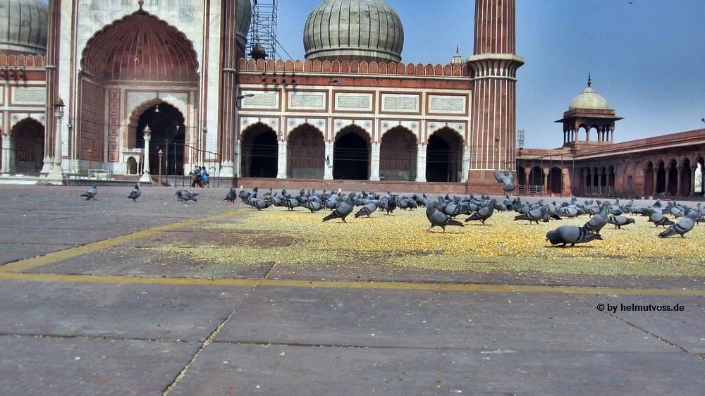 Hier sind wir in Indiens größtes islamisches Gotteshaus. Der riesige Innenhof dieses architektonischen Wunderwerkes ist zum Zeitpunkt unseres Besuchs am frühen morgen wenig besucht. Wir sind mit unserer kleinen 13 Personen starken Gruppe die einzigen Touristen auf diesem Platz.