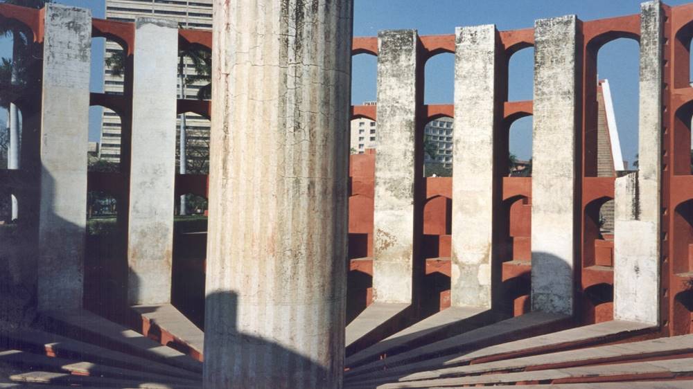 Die Anlage der Sternwarte besteht aus mehreren roten und weißen Bauten, yantras genannt, die zwischen Blumenbeeten aufragen. Sie dienten der Berechnung von Eklipsen, zur Beobachtung des Verlaufs der Planeten oder anderer astronomischer Himmelsbewegungen. |