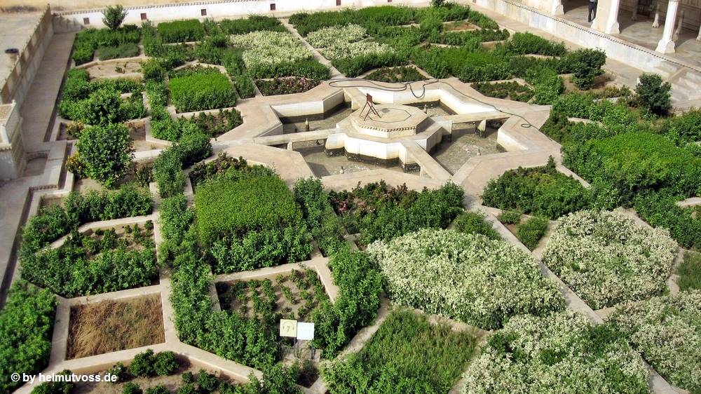 Ich glaube wir haben uns im gewirr der vielen Gänge und Räume verirrt. Im Hof ruht ein eleganter Baradari (Pavillon Bild oben rechts) auf prachtvoll skulptierten Pfeilern. |