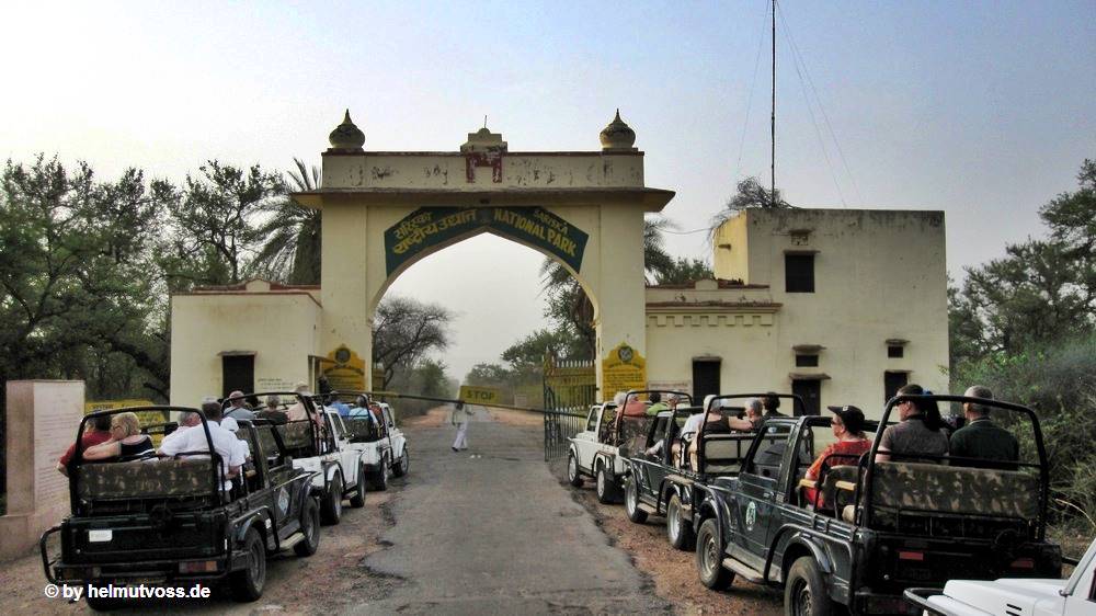 Am 2.ten Tag in Indien im Sariska Palace Hotel, 6:00 Uhr treffen auf der Terrasse, hier im Stehen eine Tasse Kaffee. Der Kaffe war Ok. Vor dem Hotel stehen die Jeeps bereit. Ausser uns noch eine Gruppe Franzosen mit insgesamt 8 Jeeps geht es um 6:30 Uhr los. Der Sariska Nationalpark in Rajasthan ist 1958 zum Schutzgebiet erklärt worden. 1979 wurde dieses Schutzgebiet Teil des "Projekt Tiger" und 3 Jahre später bekam es den Status eines Nationalparks. |