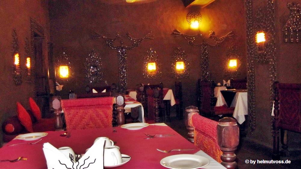 Morgens um 6:00 Uhr war es noch ruhig im etwas dunklen Speiseraum. Das Frühstück im Mandawa Desert Resort ist ganz ordentlich, der Kaffee wurde an den Tisch gebracht. |