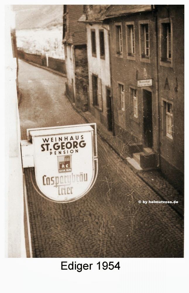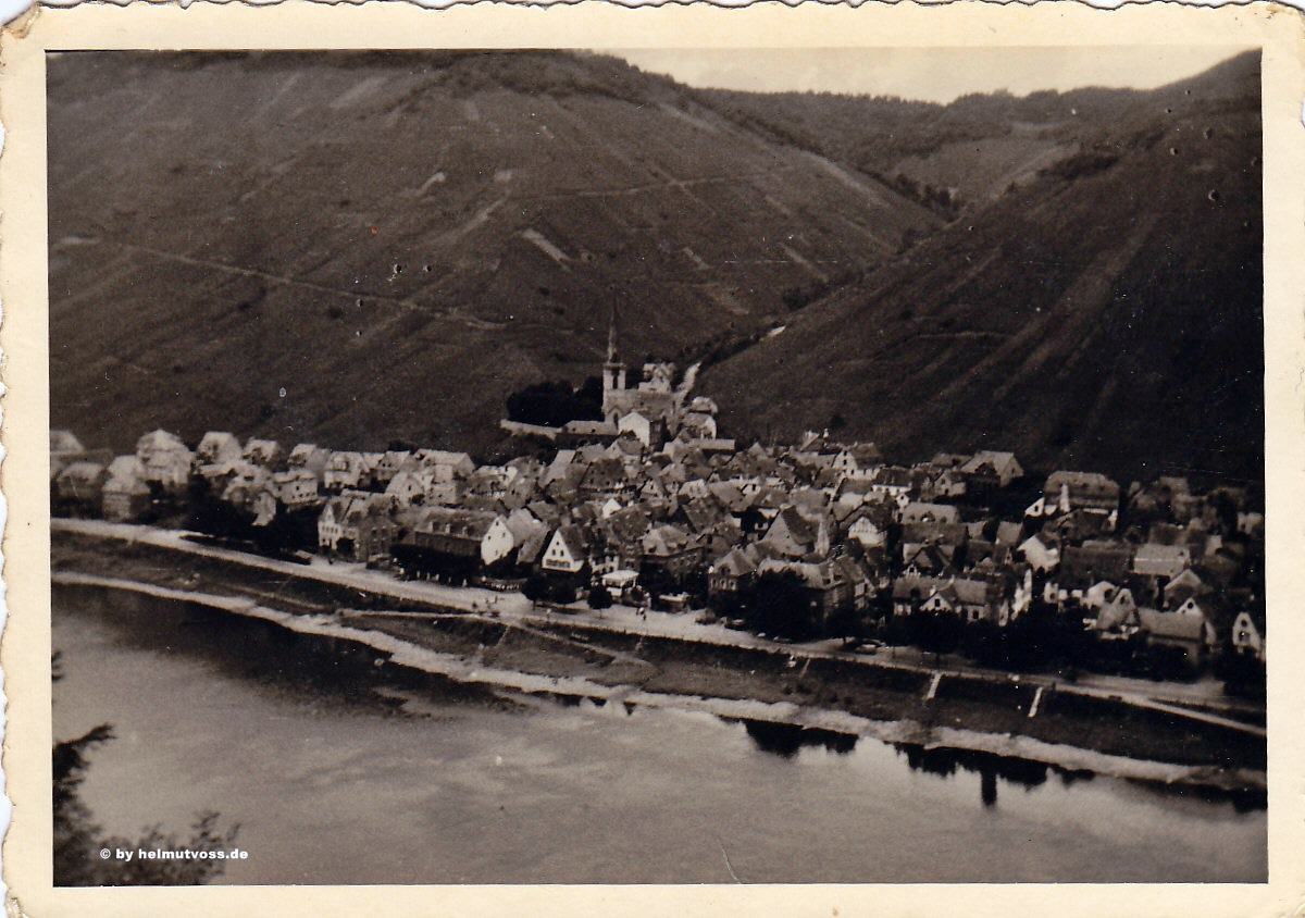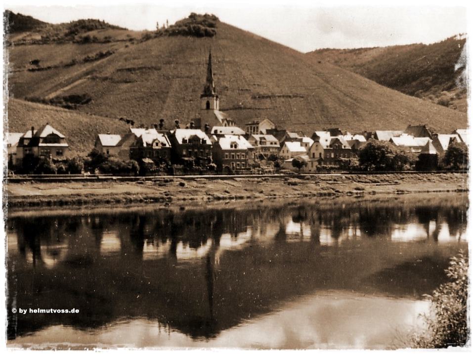 Bild oben rechts: Historische Ansicht des Ortes Ediger im Jahr 1954. Damals fuhr regelmäßig eine Fähre zum gegenüberliegenden Moselufer. |
