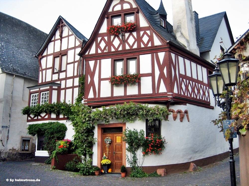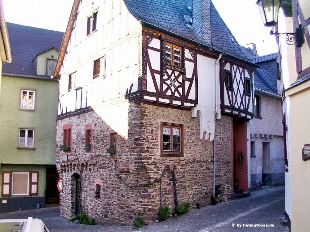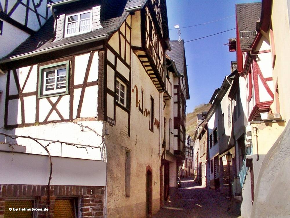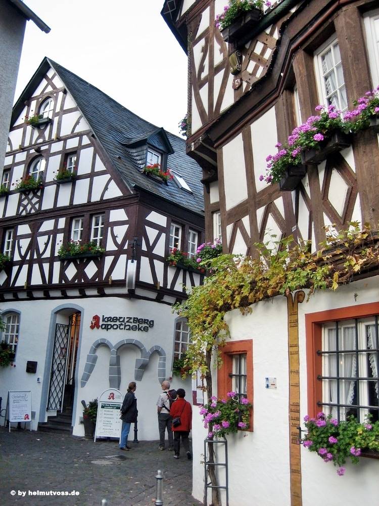 Bild oben links: Fachwerkhaus, teilweise massiv, Krüppelwalmdach, erbaut 1549. An der Moselstrasse gibt es einen kleinen Supermarkt, Gegenüber dem Frendenverkehrsamt eine Apotheke. |